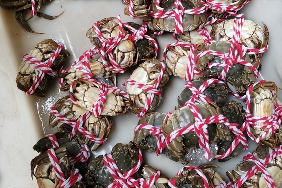 现在不是吃螃蟹的最佳季节,但市场上也有卖,很多是提前用绳子五花大绑、整整齐齐摆在台面上的。
